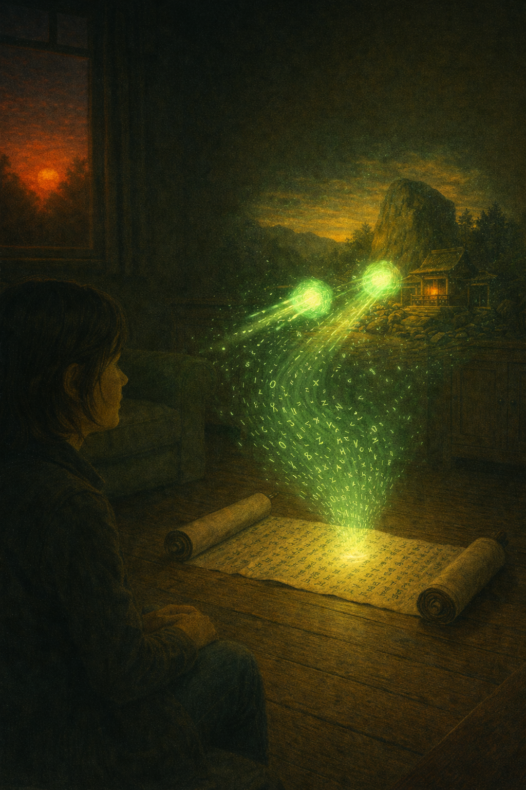回転が高速域に達した時文字が四方に散れじれにに飛び散り目の前にホログラムのように情景が映し出された。