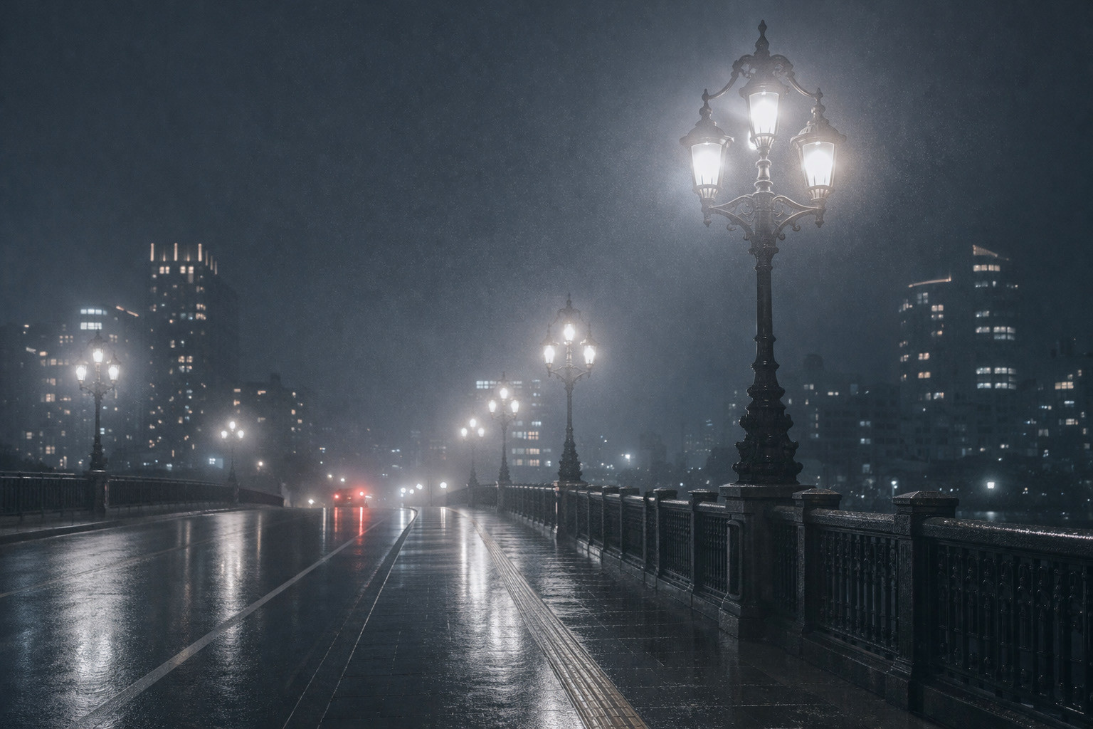 水銀燈の帯の中を、雨が風に流されてゆく。